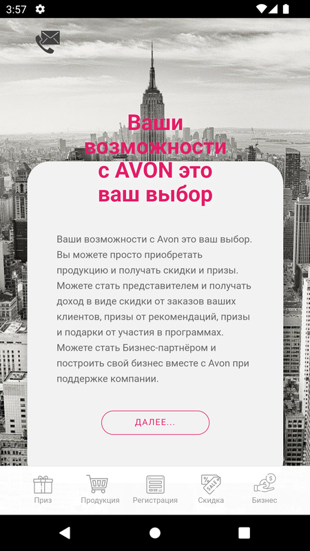 Ваши возможности с Avon это ваш выбор. Вы можете просто приобретать продукцию и получать скидки и призы. Можете стать представителем и получать доход в виде скидки от заказов ваших клиентов, призы от рекомендаций, призы и подарки от участия в программах. Можете стать Бизнес-партнёром и построить свой бизнес вместе с Avon при поддержке компании.