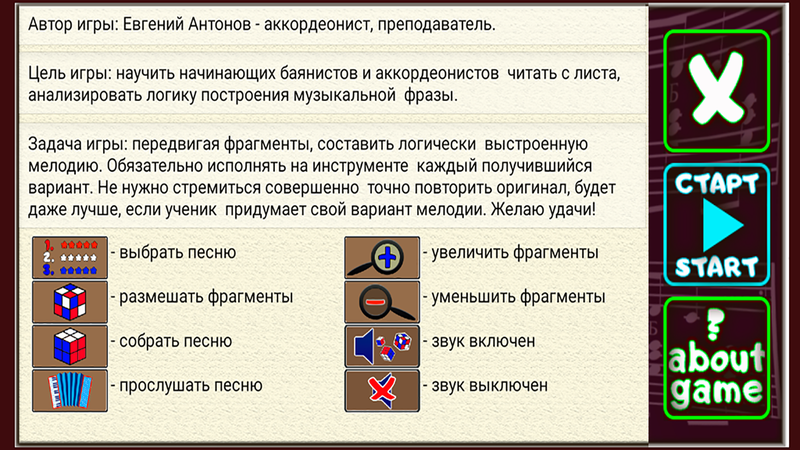 Цель игры: научить начинающих баянистов и аккордеонистов читать с листа, анализировать логику построения музыкальной фразы.