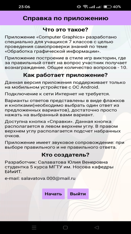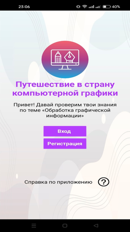 Приложение построено в стиле игры-викторины, по теме «Обработка графической информации», где за каждый правильный ответ на вопрос участник получает вознаграждение.