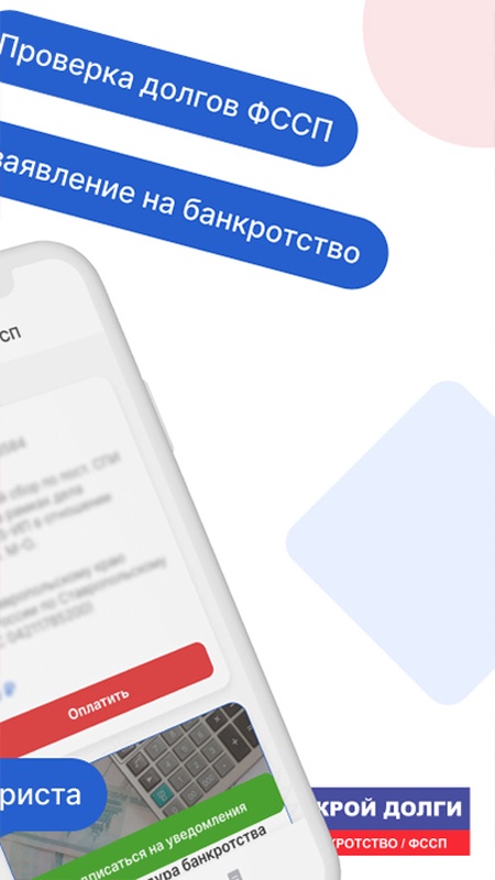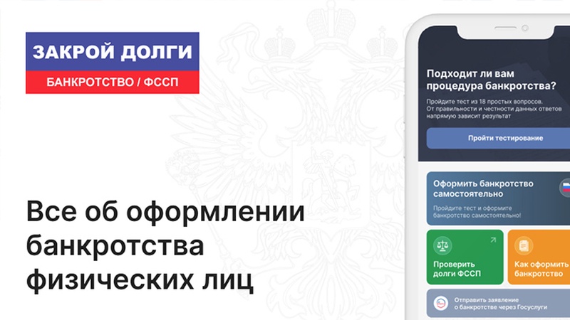 Приложение «Закрой долги – банкротство физических лиц» помогает понять, подходит ли вам процедура банкротства. Сервис позволяет узнать задолженность, самостоятельно оформить процедуру списания долгов и получить консультацию юриста онлайн. Приложение содержит тесты, благодаря которым вы за одну минуту узнаете, сможете ли вы пройти банкротство без посторонней помощи.