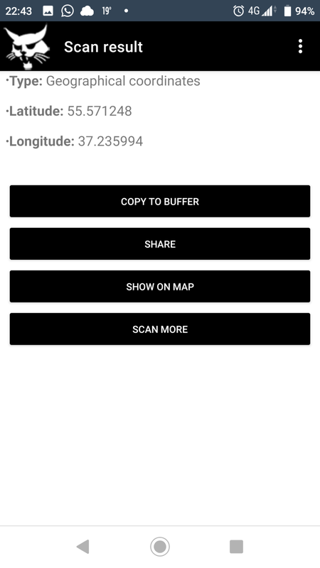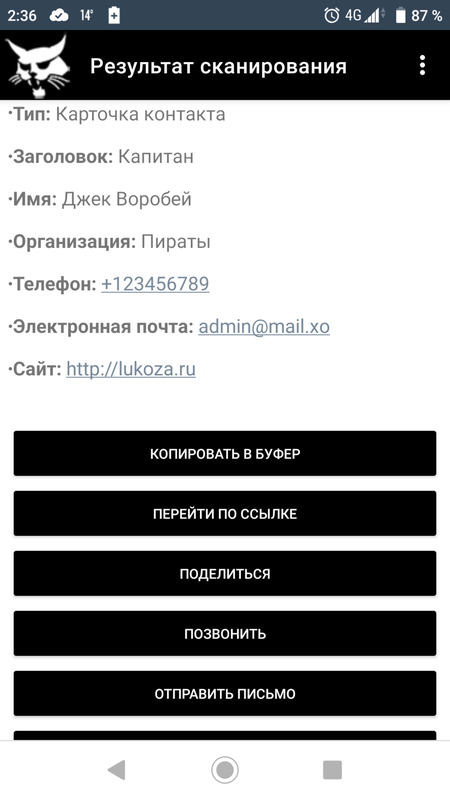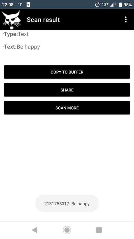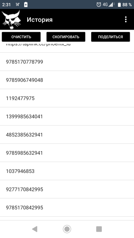 В режиме непрерывного сканирования все результаты записываются в историю. Дубликаты не заносятся. Списком истории можно поделиться либо скопировать его в буфер обмена.