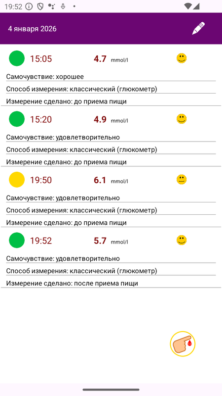В приложении Вы можете записывать результаты показаний приборов (глюкометра и других) и наблюдать за уровнем сахара в крови.