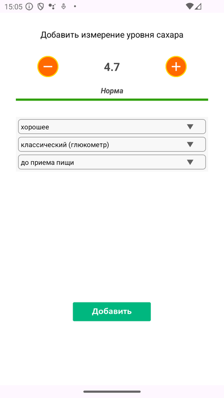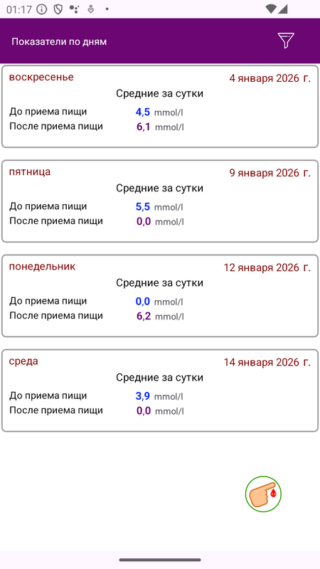 В дневнике приложения возможно записывать результаты измерения как до приема пищи, так и после приема пищи.