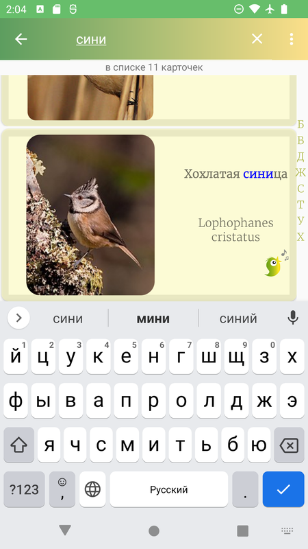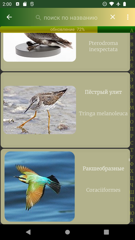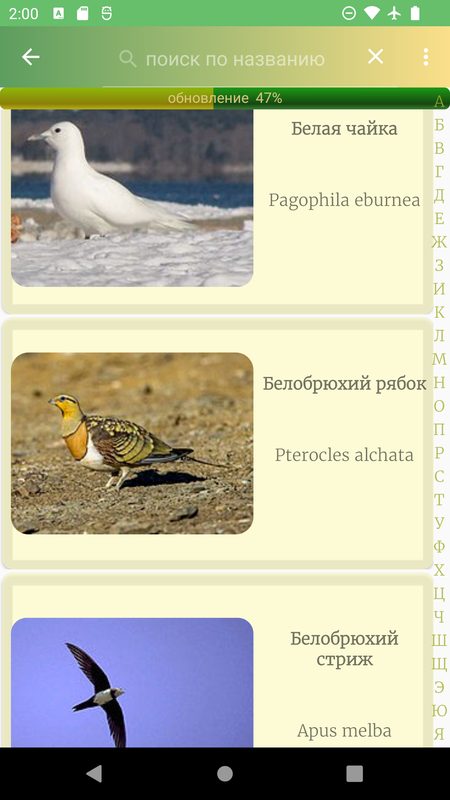 В приложении реализован поиск по русскому или латинскому названию птицы, а также удобная прокрутка списка.
