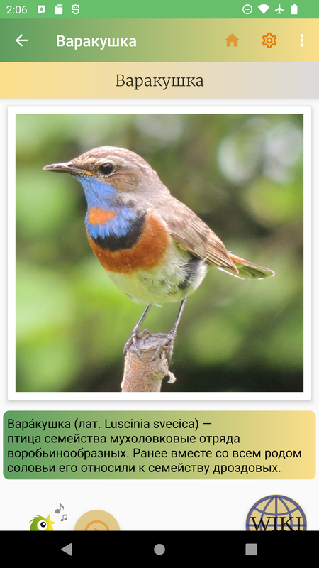 Вы можете быстро найти интересующую Вас птицу, ознакомиться с её описанием и затем перейти по кнопке на оригинальную статью на Википедии. У некоторых птичек есть звуковые файлы - можно послушать, как они поют.