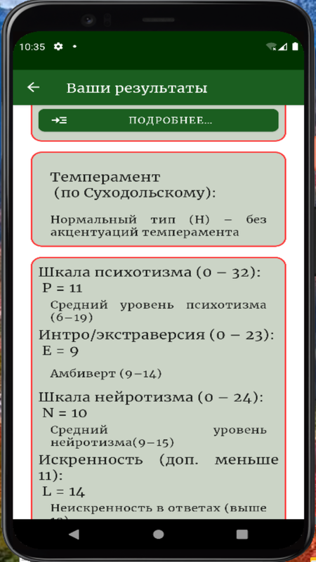 В дополнение к определению четырех основных темпераментов (флегматик, меланхолик, сангвиник и холерик) по Айзенку на основе текущего квадранта плоскости осей экстраверсии и нейротизма, предлагаемый Вашему вниманию тест также классифицирует типы по Суходольскому: «нормальный» темперамент по центру в окружении восьми акцентуированных разновидностей, которые, в принципе, перекликаются со следующим уровнем психодиагностики личности - акцентуациями характера Леонгарда-Шмишека. Кроме того, стоит упомянуть, что известные пятифакторная (так называемая «Большая пятерка») и шестифакторная (HEXACO) модели структуры личности также рассматривают факторы E и N в качестве независимых переменных.