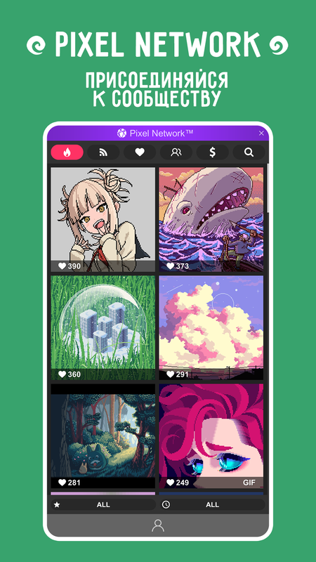 • Делитесь своими работами с друзьями и сообществом Pixel Network™