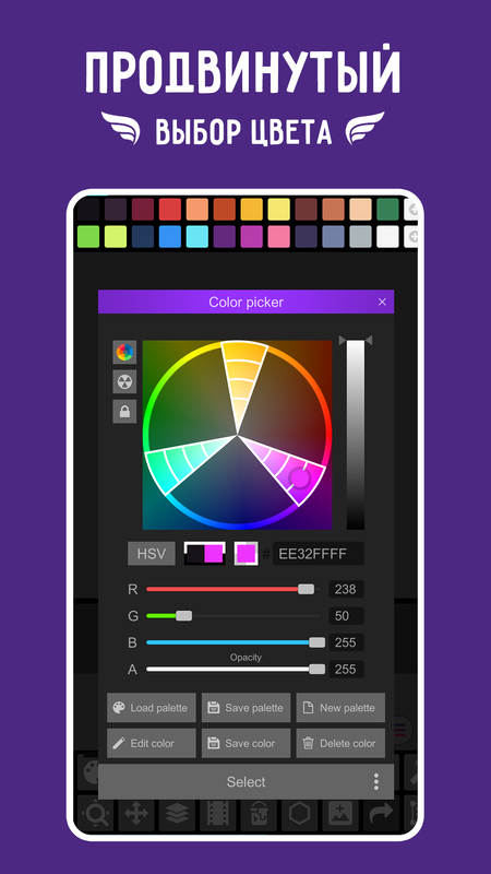 • Профессиональный выбор цвета в режиме RGBA или HSV