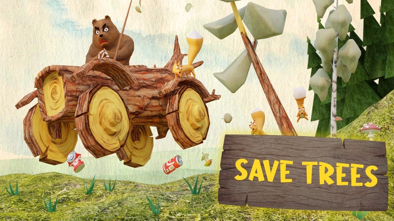 Медведь на волшебном бревне с колесами вместе с белками спешит навести порядок.