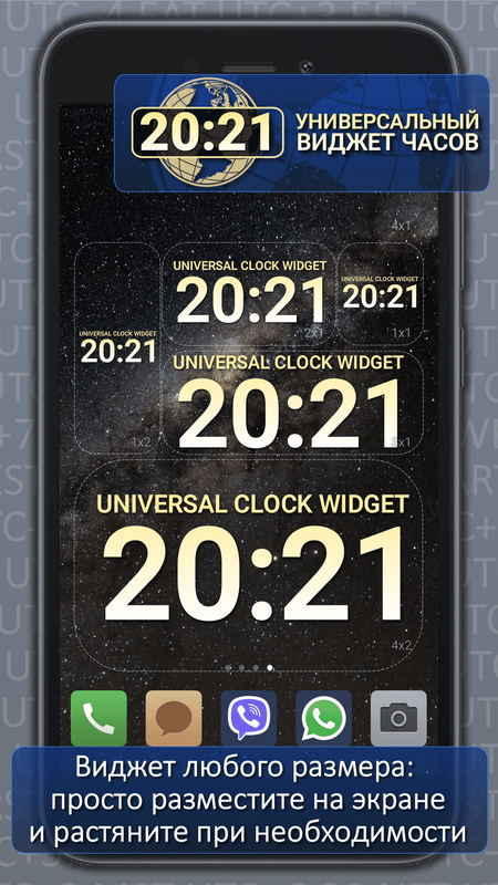 При размещении на экране, виджет имеет размер одной плитки и пытается разместить все указанные вами часовые пояса оптимальным образом. Затем вы можете растянуть его до желаемого размера (в соответствии с вашим художественным замыслом) или до тех пор, пока не достигнете удобочитаемого размера текста.