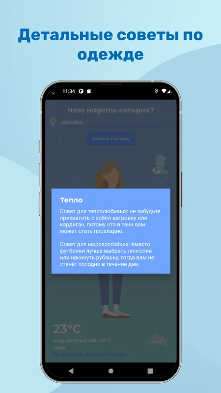 Не бойтесь свободно выбирать свой гардероб каждый день благодаря нашему новому приложению! С его помощью вы будете в курсе текущей температуры воздуха и получите самые точные советы по выбору одежды и обуви, чтобы всегда оставаться в тепле и комфорте.