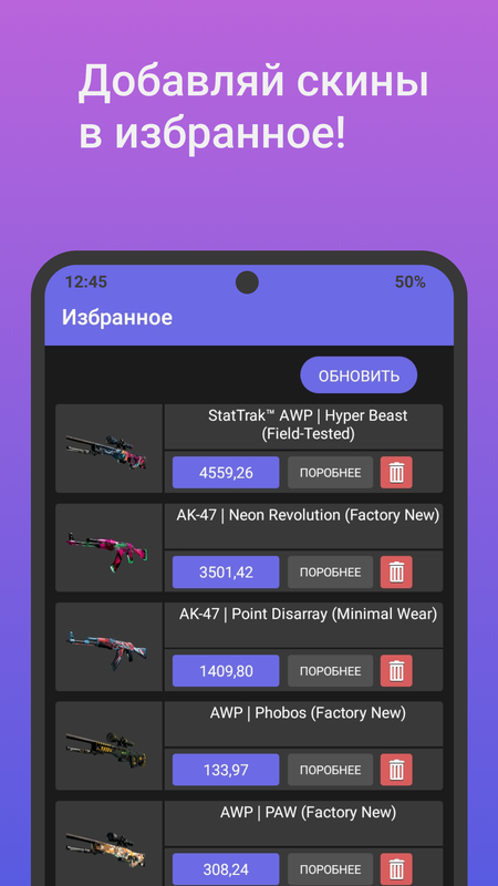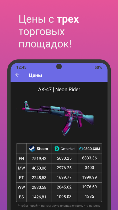Просматривай актуальные цены на любой скин с трех торговых площадок! Цены загружаются в реальном времени!