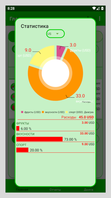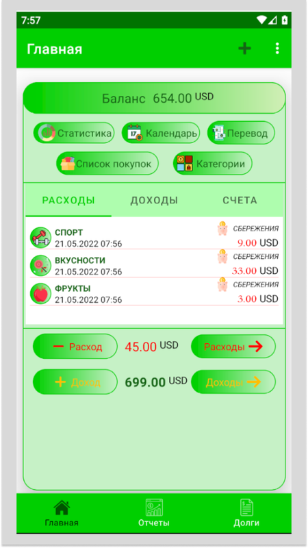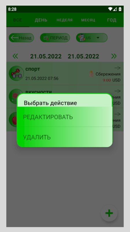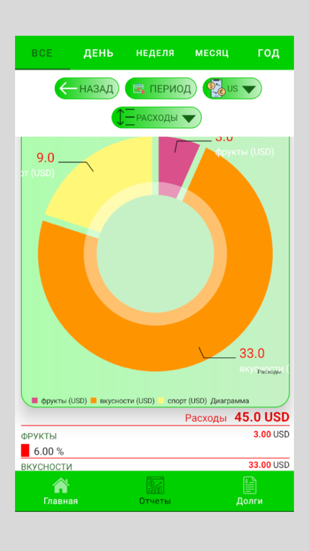 И там же можно редактировать, добавлять, удалять расходы или доходы, и при этом общая сумма, отчеты и статистика соответственно обновляться.