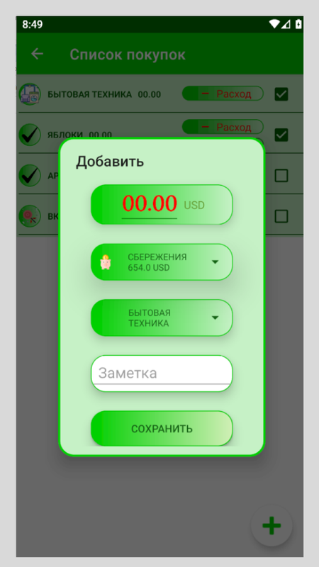 Добавление расхода или дохода - это просто вести сумма, выбрать категорию продукта(расходов), выбрать счет и если нужно, то можно написать заметку к расходу или к доходу.