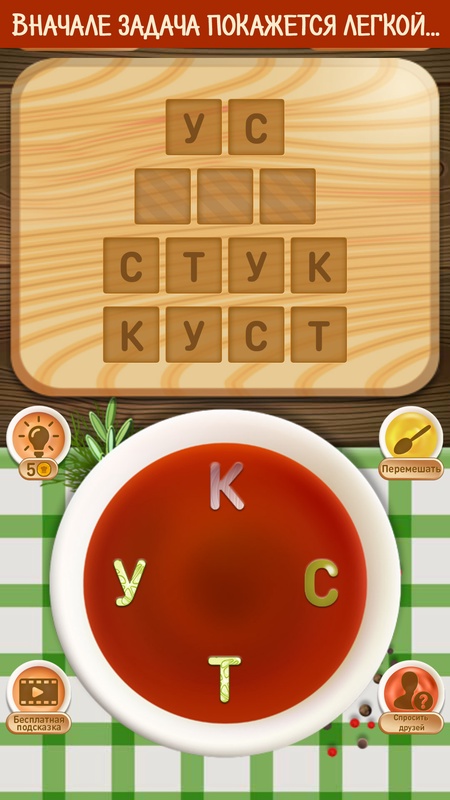 Играй в составление слов из букв. Например, из четырех букв "О Р Б Д" собери слова БОР, РОД, БРОД. Чем больше количество букв в вашей тарелке, тем сложнее собрать все слова. Если тебе незнакомо какое-либо из угаданных слов, просто нажми на него, и ты получишь пояснение. Таким образом, игра в слова не только поможет натренировать головоломками твой мозг, но и пополнит копилку знаний.
