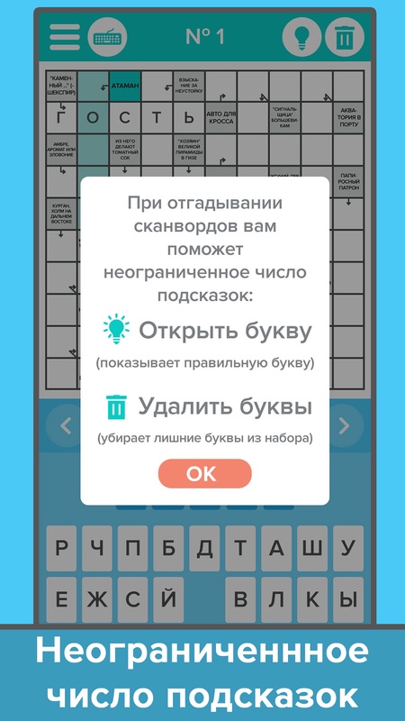 - максимально удобный процесс разгадывания;