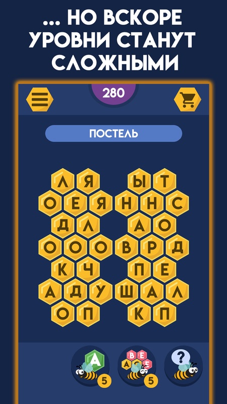 Вам предстоит поиск загаданных слов, спрятанных на игровом поле. Словесная игра сделана в пчелиной стилистике, а игровое поле с буквами напоминает соты из пчелиного улья.