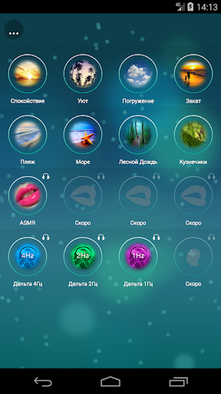 - Звуки природы: Море, Пляж, Дождь в лесу, Сверчки, Кузнечики, Поле (Насекомые), Гром, Костер.