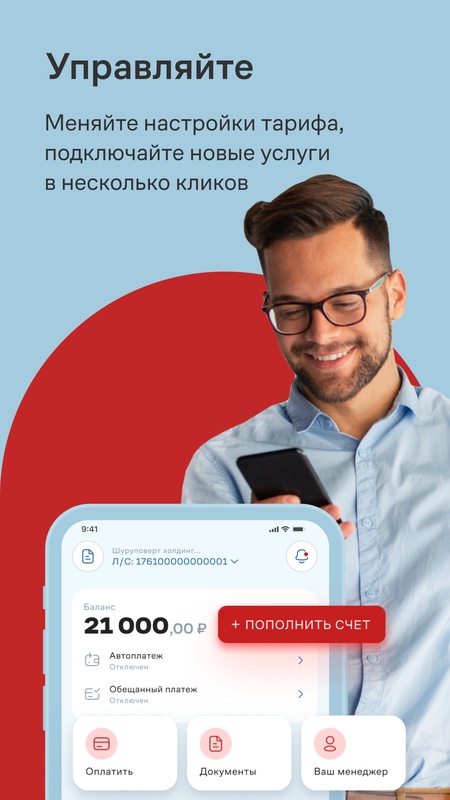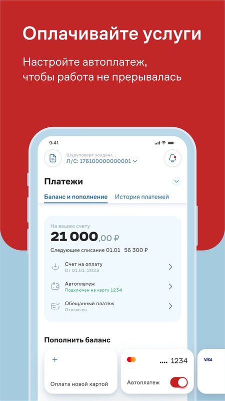 • Пополняйте баланс картой или по счету, подключайте авто- и обещанный платеж, чтобы работа не прерывалась.