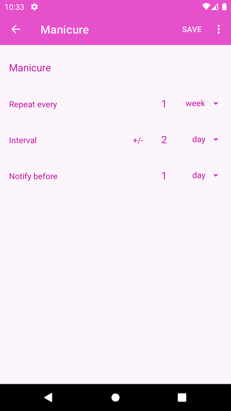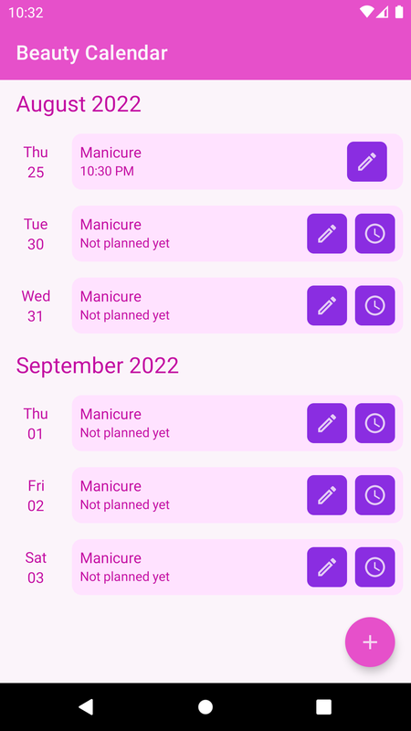 Приложение позволяет создать раписание Ваших процедур и будет напоминать о том, чтобы сделать запись вовремя. Также, оно напомнит Вам о приближающейся записи.