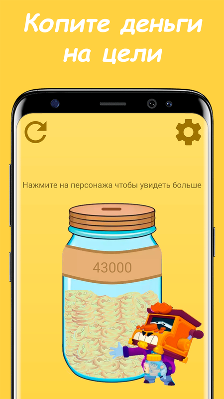 На главном экране копилки вы всегда сможете увидеть количество накопленных денег в банке, а персонаж, выбранный Вами, напомнит Вам о том, на что Вы копите, сколько это стоит и сколько осталось накопить.