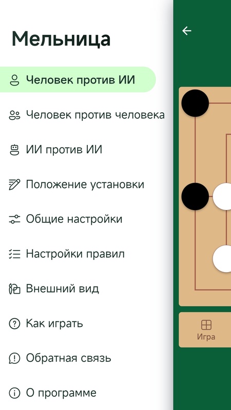* Игрок, который выстраивает три свои фигуры на линии доски, получает мельницу и может удалить фигуру(и) противника.