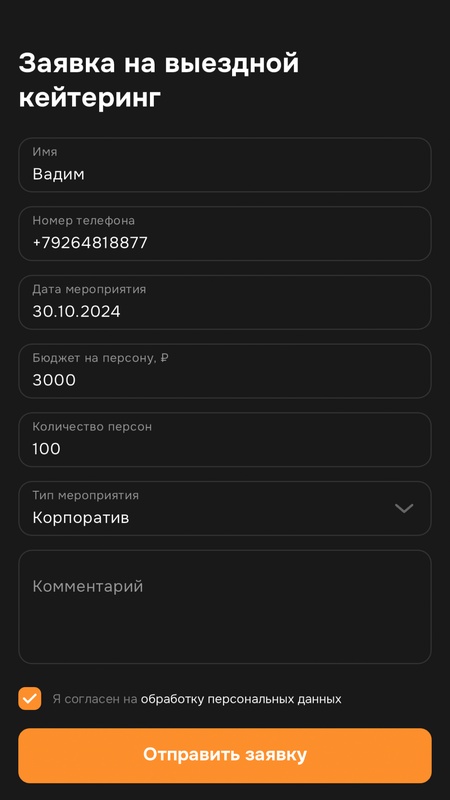 Для корпоративных клиентов у нас действуют специальные условия, в приложении есть удобная форма для создания заявки на ваше мероприятие. Персональный менеджер подберет меню по вашему вкусу и бюджету, проконтролирует заказ на всех этапах.