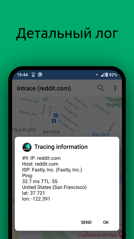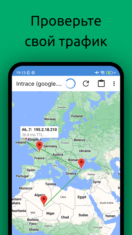 Visual traceroute позволяет легко определить любой маршрут следования данных. Эта сетевая утилита дает возможность выяснить, по каким компьютерам и через какие сервера пропускаются ваши данные, если вы желаете посетить определенный веб-ресурс в сети или же обратиться к конкретному серверу. Intrace для Android не только указывает путь, но и демонстрирует процесс его прохождения на карте. Другими словами, Intrace покажет вам не только пройденные вами адреса, но и где именно расположены сервера, через которые прошел пакет с данными.