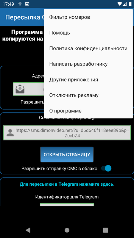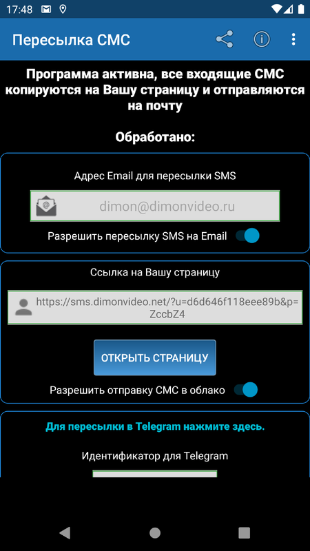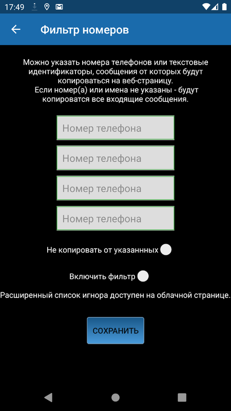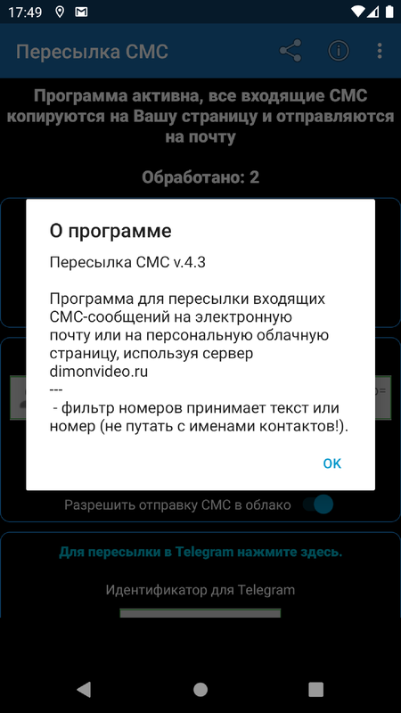 Это приложение позволяет пользователям настраивать фильтр или несколько фильтров для пересылки входящих СМС на облачную веб-страницу с возможностью просмотра по персональной ссылке или перенаправлять на email или в Telegram.