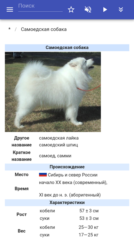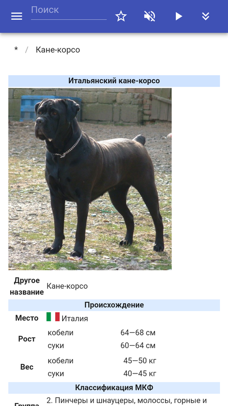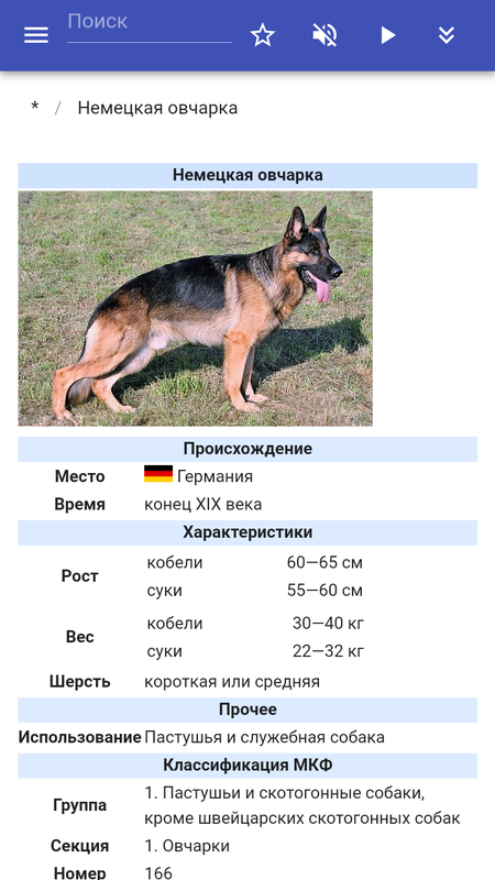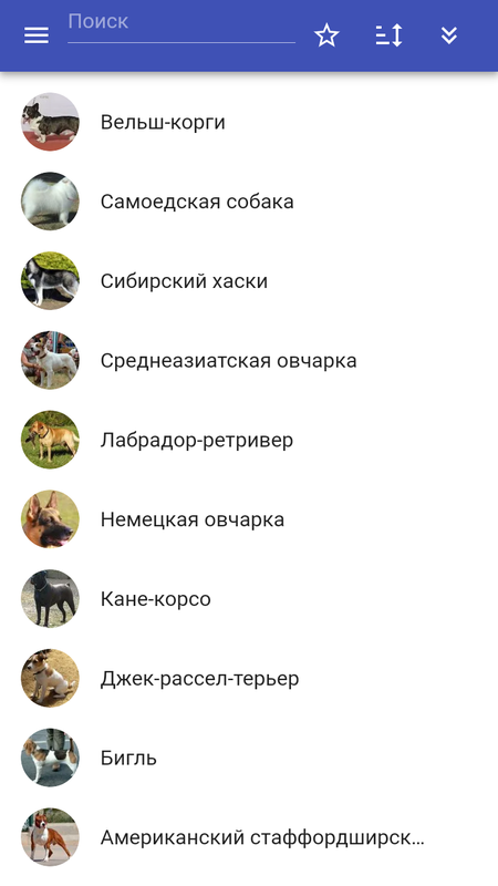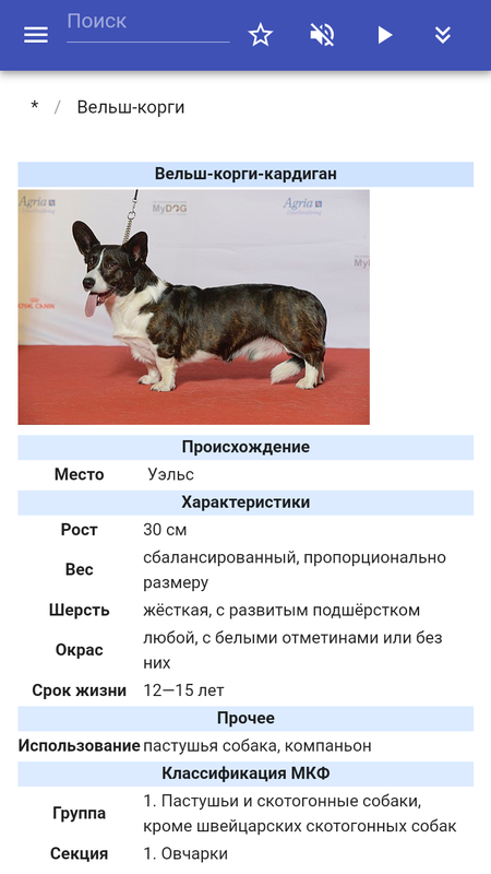 В приложении содержится описание пород собак. (вельш-корги, самоедская собака, сибирский хаски, среднеазиатская овчарка, лабрадор-ретривер, немецкая овчарка, акита-ину, кане-корсо, джек-рассел-терьер, бигль) В приложении реализованы: поиск в тексте статей, добавление заметок в статьях, озвучивание текста статей, добавление новых статей и изменение существующих, галерея изображений, фильтры и другой полезный функционал.