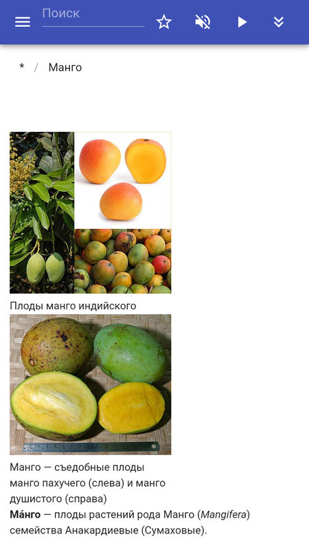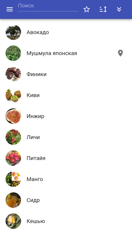 В приложении содержится описанием фруктов. (авокадо, мушмула японская, финики, киви, инжир, личи, питайя, манго, кешью) В приложении реализованы: поиск в тексте статей, добавление заметок в статьях, озвучивание текста статей, добавление новых статей и изменение существующих, галерея изображений, фильтры и другой полезный функционал.