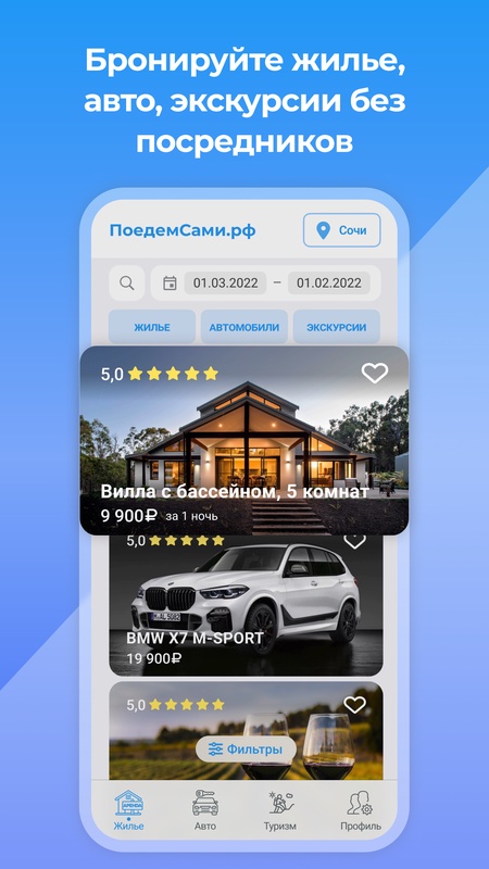 Поедемсами.рф — это сервис для бронирования жилья, автомобилей и организации туров от местных жителей. С возможностью создания собственных объявлений. Удобным управлением и гибкой настройкой отображения финансов.