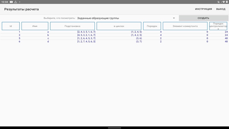 По заданным образующим подстановкам строится группа, находится порядок, центр, коммутанты, классы сопряженных элементов, силовские подгруппы, максимальные общие p-подгруппы, отображает иерархию таких подгрупп в виде интерактивной диаграммы, строит граф Кэли в 3-х мерном пространстве с различными выборками и раскрасками вершин. Предназначена для математиков и любителей математики, не содержит рекламы, картинок и разных "феничек", не требуется подключение к интернету. Время работы и другие ресурсы зависят от порядка группы и возможностей Вашего устройства.