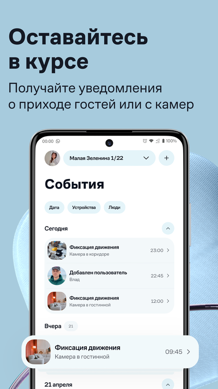 Узнайте, что произошло у подъезда. Камера реагирует на движения, а все события в видеоархиве отмечены специальной меткой — вам не придется просматривать весь архив.