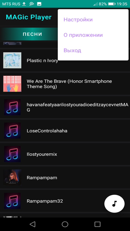 Приложение "MAGic Player" состоит из нескольких разделов: "Песни", "Альбомы".