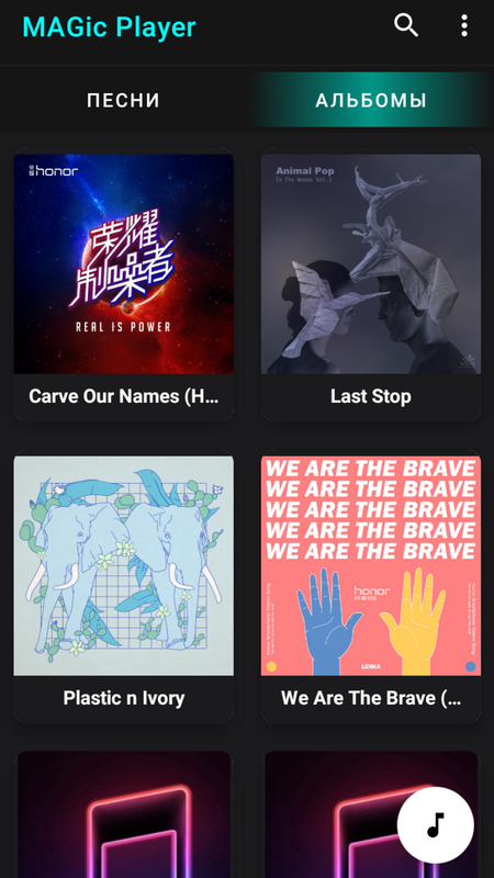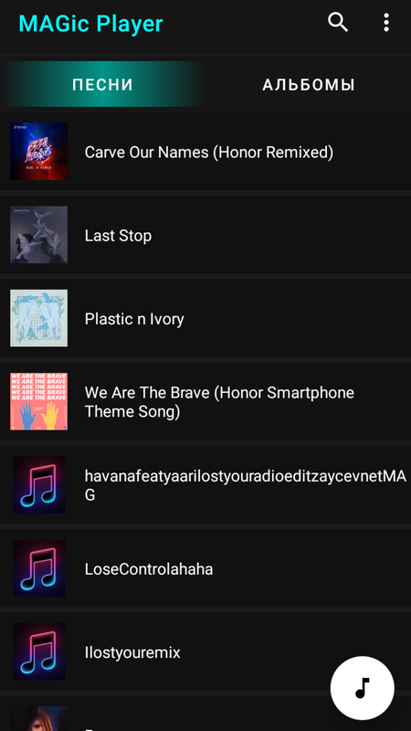 Приложение "MAGic Player" состоит из нескольких разделов: "Песни", "Альбомы".