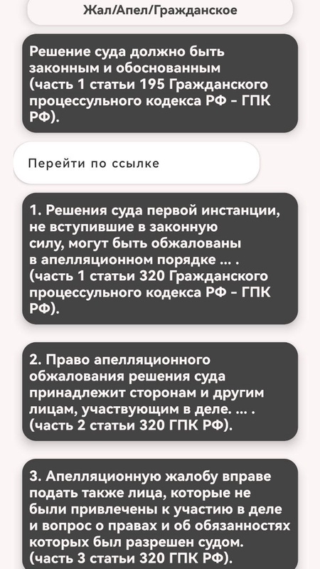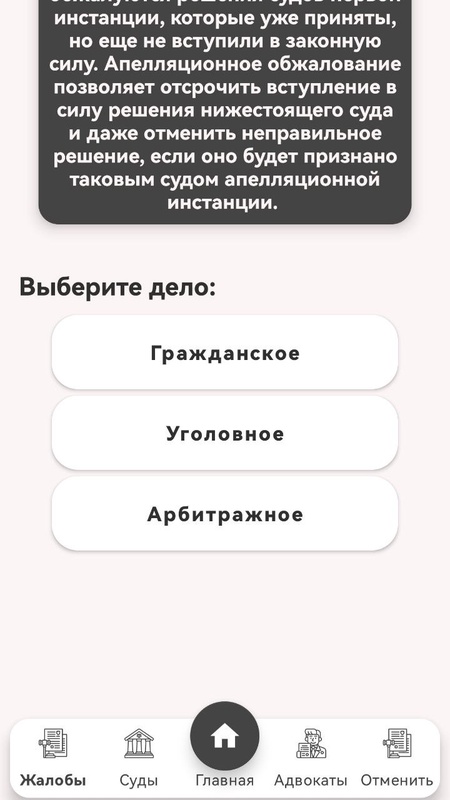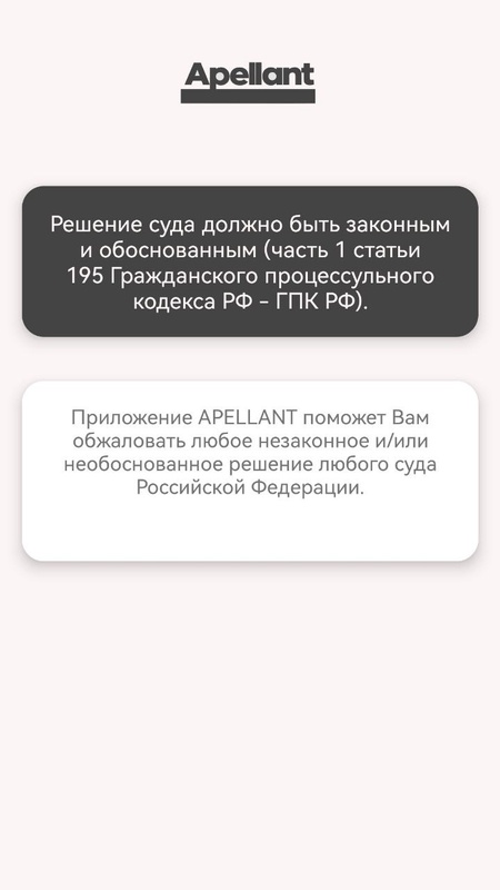 Как гласит Закон: "Решение суда должно быть законным и обоснованным" (часть 1 статьи 195 Гражданского процессуального кодекса Российской Федерации). Но так бывает далеко не всегда. Приложение поможет лучше понять, как обжаловать незаконное и необоснованное решение суда, что такое "апелляция" и "кассация" по гражданским, уголовным и арбитражным делам. Для этого в приложении имеются ссылки, которые "открывают" соответствующие статьи кодексов и сайты судов (требуется Интернет). Также имеется возможность обратиться к адвокату за помощью в подготовке апелляционной или кассационной жалобы по конкретному делу.