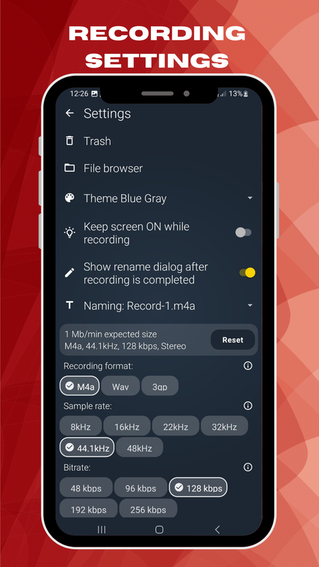 В настройках вы можете установить частоту дискретизации, битрейт (только для AAC) и выбрать между моно и стерео. Выбранные настройки напрямую влияют на размер файлов записей.