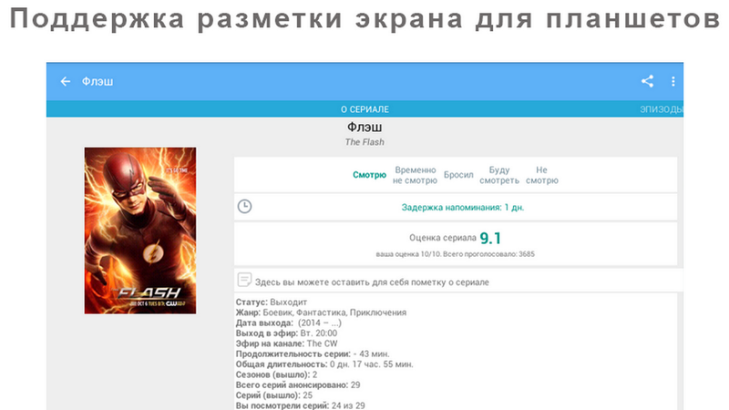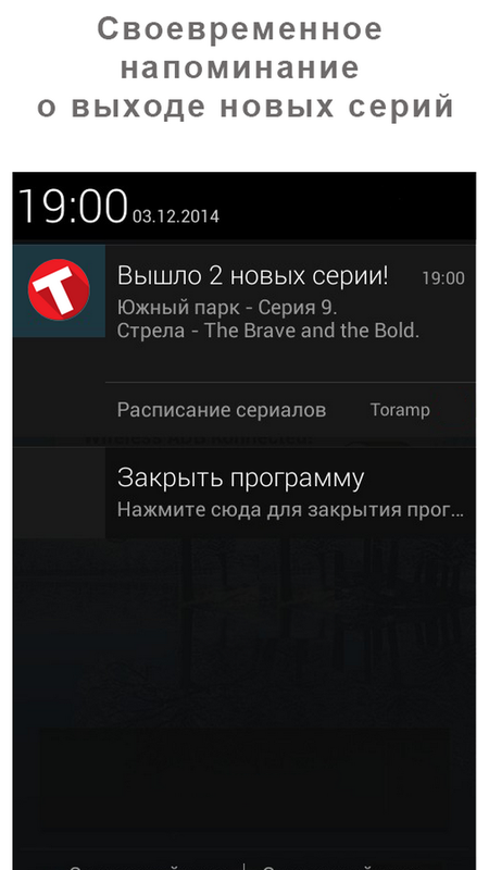 • Создание своего расписания сериалов и получение уведомлений при выходе новых серий