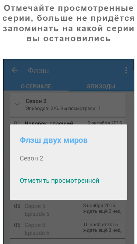 • Возможность отмечать просмотренные серии. Вам больше не придётся запоминать, какую серию вы смотрели последней
