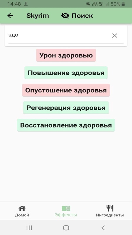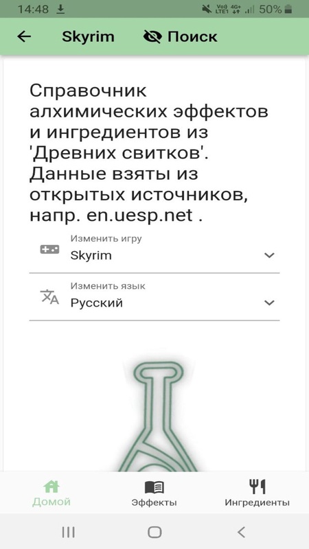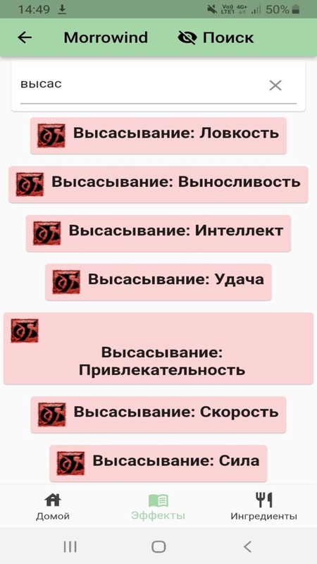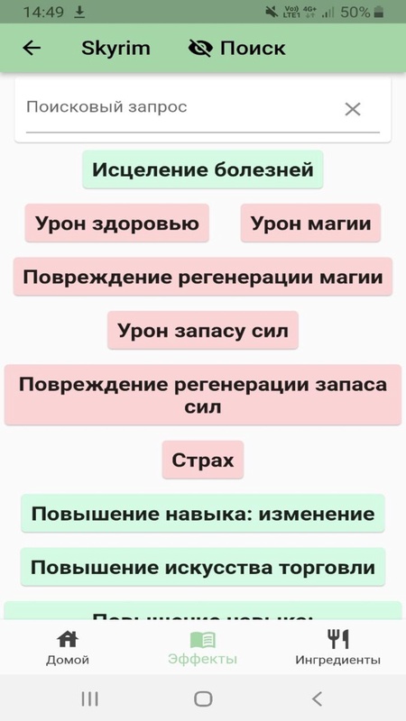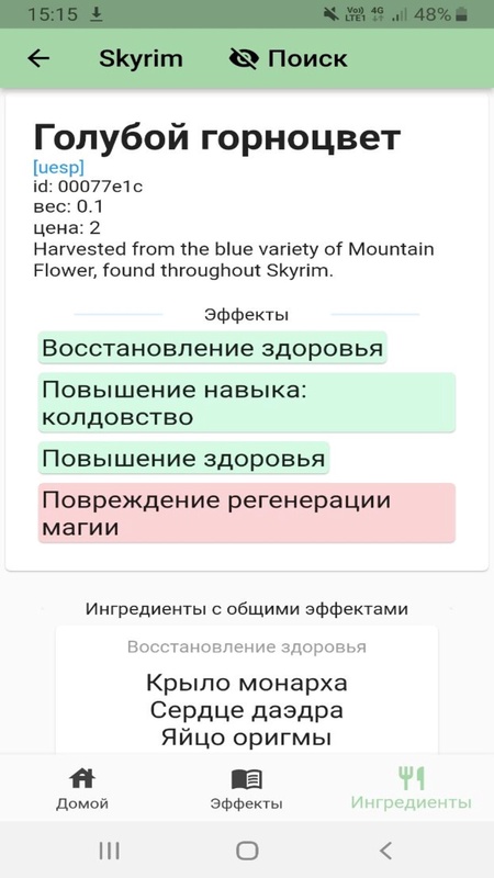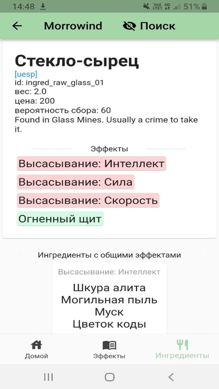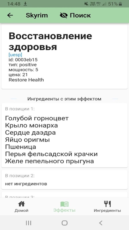 Приложение представляет собой список алхимических ингредиентов и их эффектов.