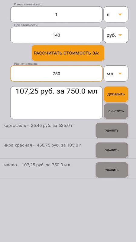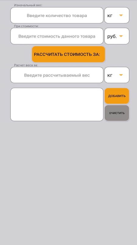 Калькулятор рассчитывает цену товара за килограмм, грамм, литр, миллилитр с возможностью добавления в заметки для сравнения.