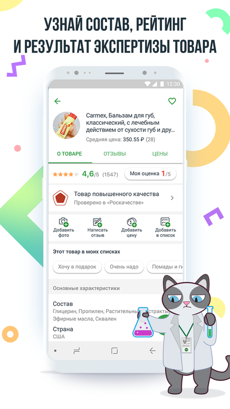 Наведите камеру на штрих код или Data Matrix и приложение покажет отзывы, состав, вредные E-добавки, производителя, среднюю цену в магазинах, оценку и отзывы участников сообщества. Вы увидите, если товар в черном списке Росконтроля, и какая у него оценка Роскачества. Сканируйте штрих код или Data Matrix и выбирайте только лучшие товары для правильного питания по лучшей цене, в нашей базе их более 30 млн. — продукты питания, алкоголь, косметика, бытовая химия и десятки других категорий. Поддерживайте свое правильное питание зная информацию через сканер штрих кодов!