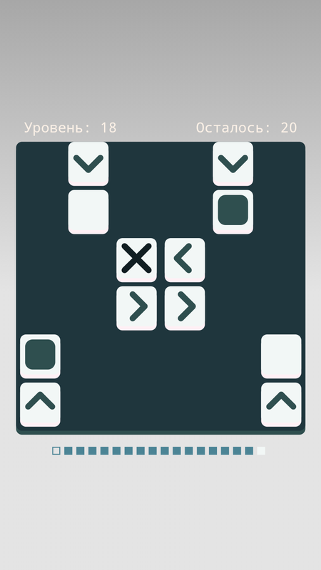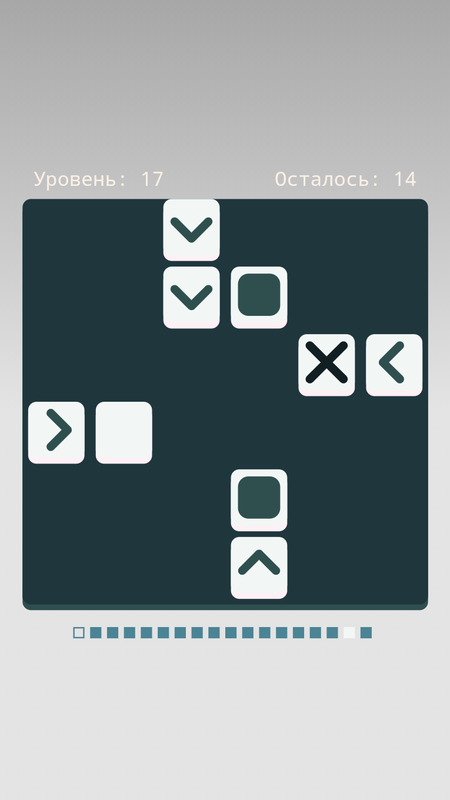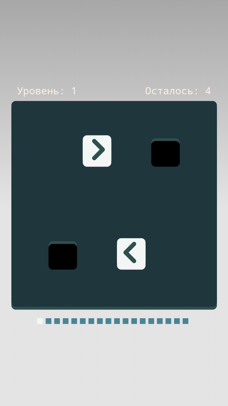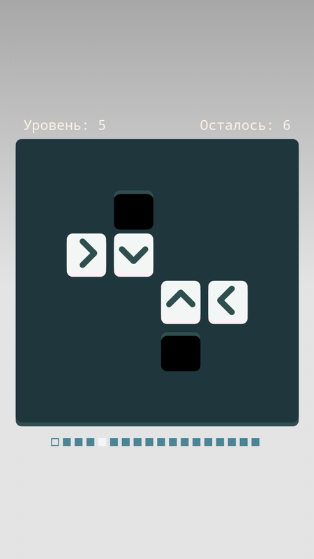 Перемещай квадраты по полю, что бы они все провалились в отверстия. Направления возможного движения квадратов указаны стрелками. Если стрелки на квадрате нет, значит квадрат сам не двигается, но его могут толкать другие двигающиеся квадраты. При нажатии на квадраты с изображением черного квадрата под ним образуется отверстие. Квадраты с крестами при нажатии исчезают. Количество ходов на каждом уровне ограничено.