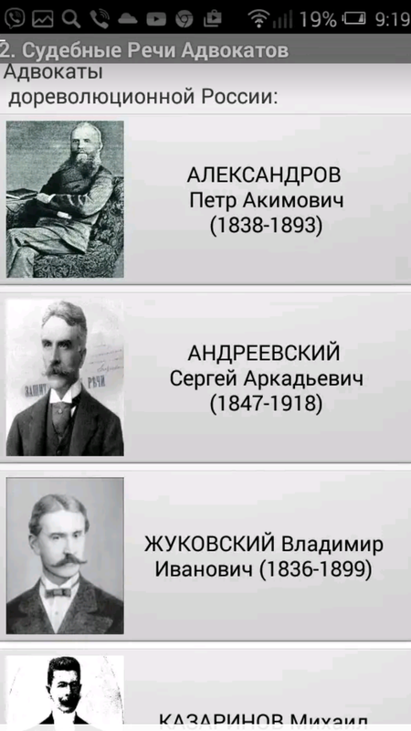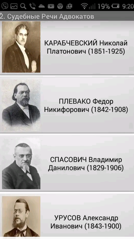 В текущем 2022 году исполняется 20 лет федеральному закону "Об адвокатуре и адвокатской деятельности". Одновременно отмечается и юбилей современной российской адвокатуры. Публикация приложения "Судебные Речи Адвокатов" посвящается указанному событию и содержит тексты судебных речей известных дореволюционных адвокатов (и не только дореволюционных), а также краткую информацию о них. Выбор составителя сборника (разработчик приложения - адвокат Кравченко Леонид Анатольевич) пал на таких метров адвокатуры, как: АЛЕКСАНДРОВ Петр Акимович, АНДРЕЕВСКИЙ Сергей Аркадьевич, ЖУКОВСКИЙ Владимир Иванович, КАЗАРИНОВ Михаил Григорьевич, КАРАБЧЕВСКИЙ Николай Платонович, ПЛЕВАКО Федор Никифорович, СПАСОВИЧ Владимир Данилович, УРУСОВ Александр Иванович, ХАРТУЛАРИ Константин Федорович, ЛАНИН Александр Иванович, АРИЯ Семен Львович, ШМИДТ Юрий Маркович. Также в приложении приводится историческая справка об учреждении адвокатуры в дореволюционной России.
