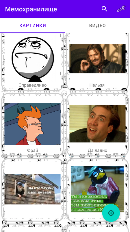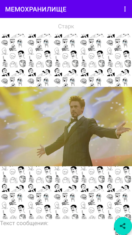 Персональный агрегатор мемов. Создайте свою коллекцию мемов на все случаи жизни. Добавляйте картинки и видео из встроенной галереи или пересылайте из других приложений. Отправляйте мемы в любой мессенджер. Картинки, гифки, видео, ссылки на youtube. Просматривайте мемы перед отправкой, добавляйте подписи и тэги. Используйте встроенный механизм для быстрого поиска нужного мема. Используйте экспорт, чтобы сохранить в архиве всю коллекцию, и импорт, чтобы добавить её обратно. Единый набор на случай важных переговоров теперь на расстоянии клика!