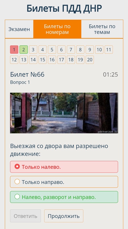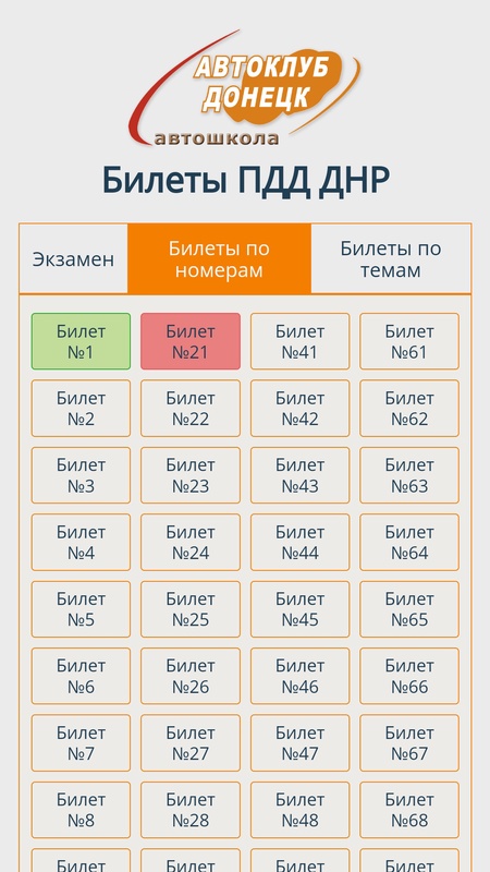 Прогресс пройденных билетов сохраняется и помечается цветом. Крассным - если допущено более 2 ошибок, и зелёным - если билет пройден. Допускается 2 ошибки.