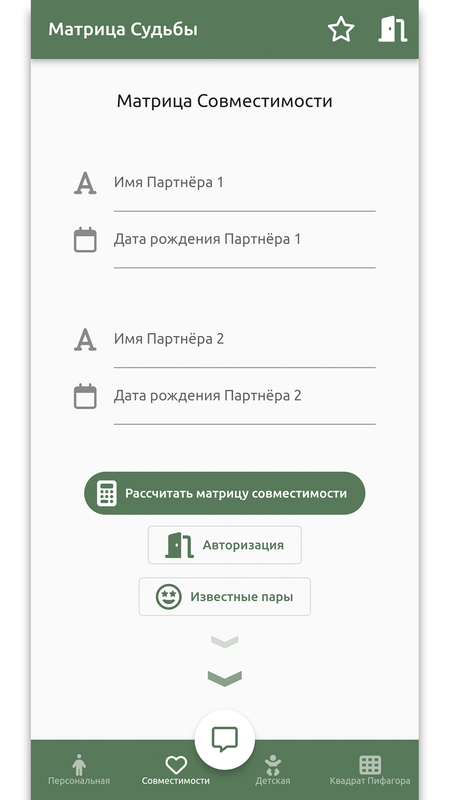 Матрица совместимости – это расшифровка судьбы двух людей, которая определяет, насколько они совместимы друг с другом в долгосрочной перспективе. Для получения матрицы совместимости приложение запрашивает данные о двух людях: их даты рождения. После этого приложение рассчитывает совместимость двух людей на основании сходств и различий в их судьбах.