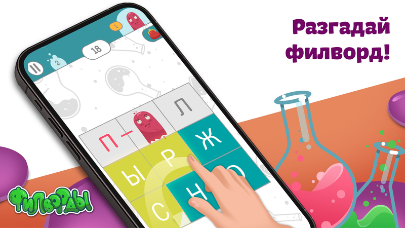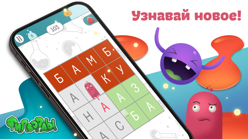 🧪⚗️Филворды — это интеллектуальное наслаждение и отдых! Составляй слова, ищи смыслы, заполняй сосуды — симпатичные монстры помогут пройти игру до самого конца.