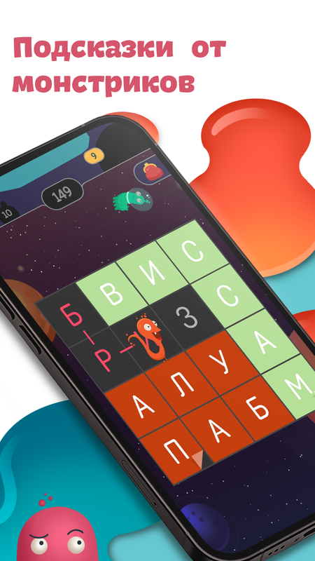 👾Если ты потерялся и не видишь слов, то цветные монстрики подскажут тебе, с чего начать. С каждым уровнем сложность игры возрастает, а угадывать слова все интереснее.